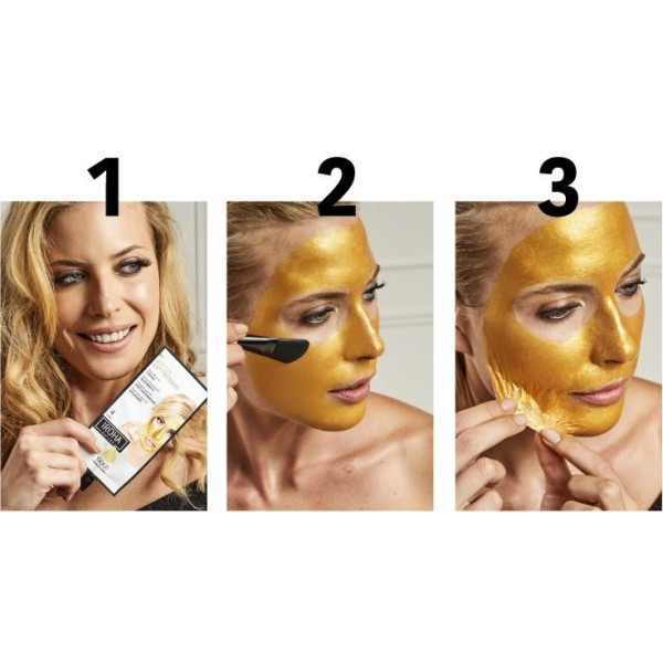 Patchs pour les yeux en tissu doré Extra fermeté 2 pièces. Masque hydratant et raffermissant pour le visage Gold Tissue 1 unité. Vliesmasque Foil Hydra - Effet Sauna - imprégné dun sérum 24K Or Collagene.