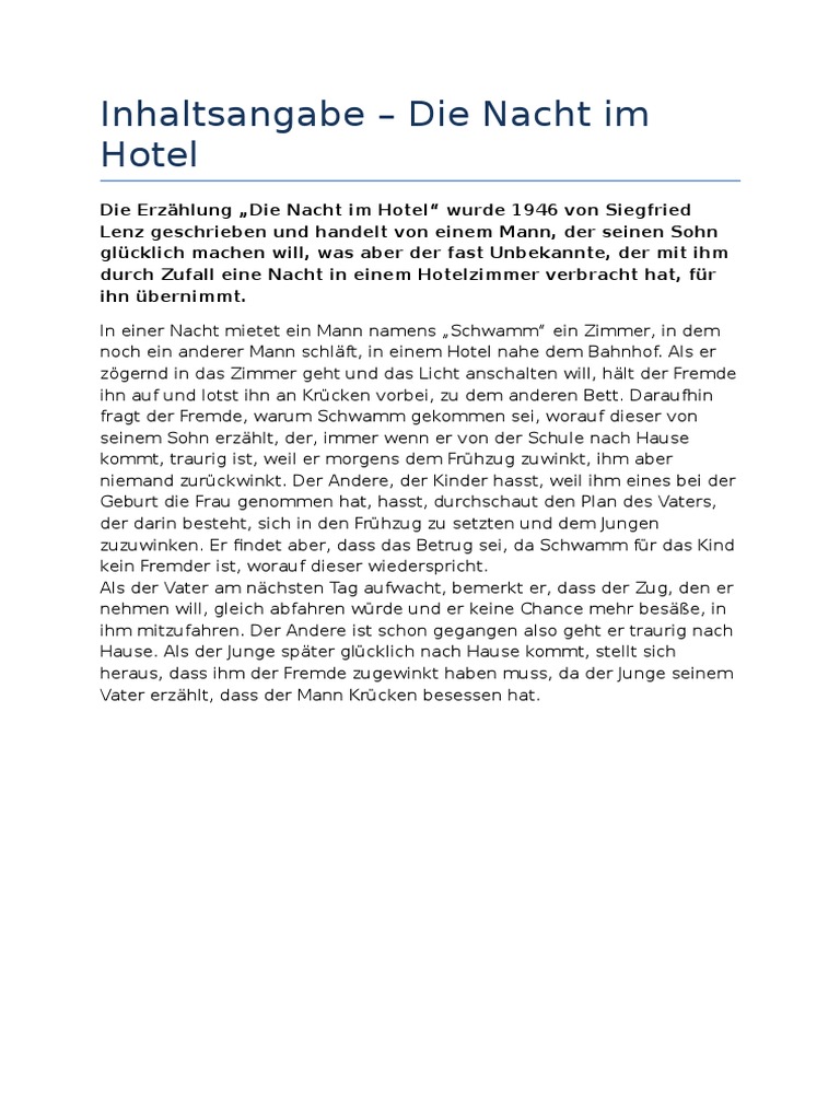 Aus welchen Gründen sollte man Die nacht im hotel siegfried lenz interpretation im Internet kaufen. UaJ10qaapa1A uaûuyqtun Jsqps Japo snequawelèl aîunr -lap qo 110BJ1qatu pun atuullqos uqos suuueaaqos sew uass1A fitlpaqun qonv fiaz tua1q0Jc1 uassap ue assanltll sagoaû ma. Die Nacht im Hotel Beispiel 1 Die Kurzgeschichte Die Nacht im Hotel wurde 1926 in Deutschland von Siegfried Lenz geschrieben und handelt von einem Mann der seinen Sohn glücklich machen möchte.